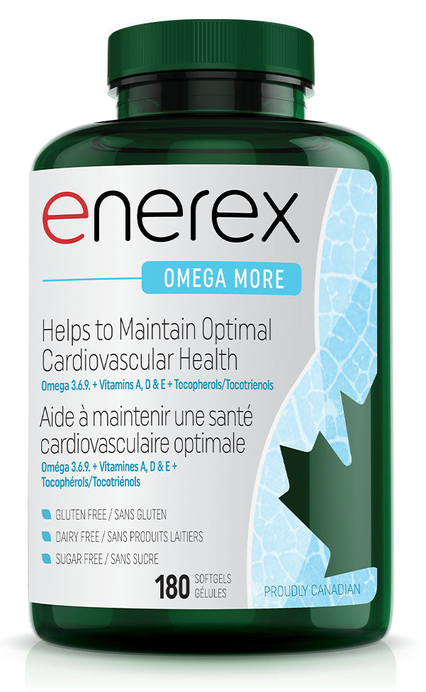 ENEREx - Omega More 180's - 180 Softgel(s) - NPN: 80036940 -- This innovative blend provides high potency Omega 3s from wild fish with beneficial Omega 6s from Evening Primrose and Borage Oils plus immune boosting Vitamins A, D, and Vitamin E mixed tocopherols. This product helps to support cardiac health, your brain and nervous system, balance hormones, and manage or reduce inflammation.