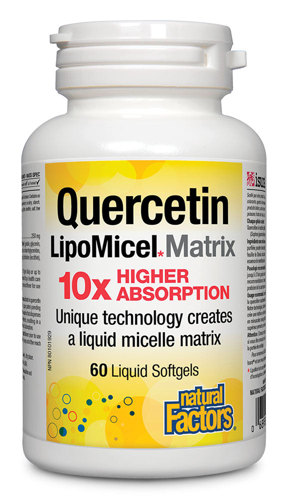 NATURAL FACTORS - Quercetin Lipomicel Matrix - 60 Softgel(s) - NPN: 80101929 -- Natural Factors Quercetin LipoMicel Matrix contains an enhanced source of the antioxidant quercetin that is used in herbal medicine to protect blood vessels, protect against oxidative stress, and provide immune support. Our unique patent-pending technology creates a liquid micelle matrix that disperses quercetin into tiny micro-droplets, resulting in 10 times higher absorption than standard forms