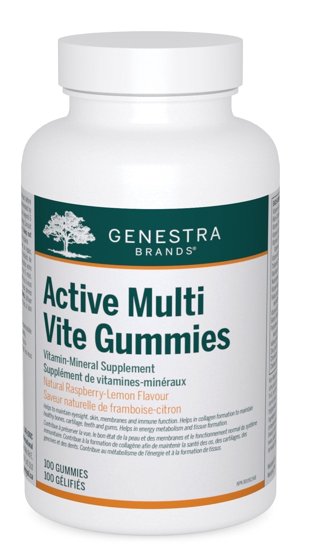 Genestra - Active Multi Vite Gummies - 100 Gummies - NPN: 80092348 -- Active Multi Vite Gummies provide a concentrated combination of 17 vitamins and minerals in a great-tasting format with added choline and an organic fruit blend. Many Canadians do not consume adequate amounts of essential vitamins and minerals. This formula is packed with high levels of nutrients to help promote optimal nutritional status, including two forms of vitamin A, all eight B vitamins, antioxidants vitamins C and E, bone-supporting vitamins D and K, and the minerals zinc, iodine and chromium. Collectively, this formula promotes immune function, antioxidant defence, energy and healthy glucose metabolism, strong bones and teeth, eyesight and night vision, and healthy hair, skin and nails. Choline is also included to provide valuable support to the liver. Additionally, each berry-shaped gummy contains only 0.5 g of sugar from natural sweeteners and isomalto-oligosaccharides, a low-glycemic plant-based fibre naturally found in fermented foods and honey. Free of gelatin as well as artificial colours and flavours, Active Multi Vite Gummies provide a convenient and delicious way of increasing the daily intake of bioavailable vitamins and minerals.