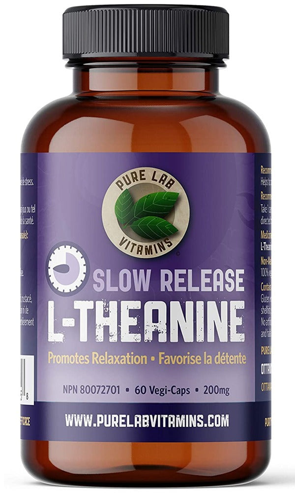 Pure Lab Vitamins - L-Theanine Slow Release - 60 Veg Capsules - NPN: 80072701 -- L-Theanine was first discovered in 1949 as a unique amino acid found in Green Tea. It helps reduce nervousness and restlessness and promotes relaxation, without causing drowsiness. L-theanine has been found to be beneficial for those who suffer from stress and stress-induced anxiousness, and can help increase focus during times of stress.L-Theanine can have a direct influence on our brains, increasing so-called Alpha Brain Waves, which are only present when we are alert and relaxed.It helps regulate calming neurotransmitters, dopamine, serotonin and GABA and simultaneously inhibits the effects of the stress hormone norepinephrine.All this allows it to help improve mood, sleep and learning capacity, while reducing the feeling of being stressed.Chronic Stress, a common condition in our fast pace world, is known to contribute to cardio-vascular disease, impaired immunity, headaches, insomnia, obesity, depression, The list goes on and on.L-Theanine, in our 250 mg regular caps, reaches body circulation and the brain within 30 to 40 minutes. It calms racing thoughts, relaxes us and at the same time increases concentration and alertness.When taken at bedtime, customers report significant benefits with problems of waking up too early with spinning thoughts. Especially when combined with Magnesium Glycinate or Magnesium Glycinate Nighttime at bedtime.