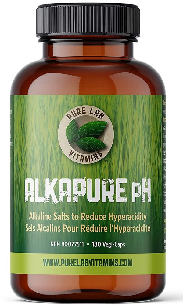 Pure Lab Vitamins - AlkaPure pH - 180 Veg Capsules - NPN: 80077511 -- Antacid Containing Alkaline Salts to Reduce Hyperacidity and Also Acid IndigestionAlkaPure pH contains the two components that the body naturally uses to balance Acidity it replenishes the body's alkaline reservoirs that are drained by stress and our Standard American Diet (SAD).A healthy body is in balance. Mineral Balance, Hormonal Balance, Acid-Base BalanceWhen talking about Acid-Base Balance (pH Balance) we have to distinguish between Gastric Acid and Systemic Acidity.We need healthy amounts of acid in our stomach to break down proteins, fats and carbs, to absorb all minerals and to function as a natural barrier for bad bacteria, parasites, and fungi.The body compensates by sacrificing its alkaline reservoirs - minerals from bones and muscles - and the two buffering systems of the blood Bicarbonate and Phosphate Dibasic.AlkaPure pH, when taken between meals, rebalances gastric acid and replenishes the body's buffering systems. Bones and muscles no longer need to sacrifice their supplies. Reflux, believed to be caused by too much stomach acid, and treated with acid blocking drugs,can often be caused by the exact opposite: too little alkalinity.Why else would the elderly, who have a low gastric acid production, have such trouble with reflux symptoms? But the acidity issues do not end with just reflux.Even a slightly acidic body has a higher tendency to create inflammation, usually in peripheral tissues, like:Tendons: Plantar Fasciitis, Bursitis, Carpal Tunnel, Tennis Elbow,Skin: Rosacea, Psoriasis, Dermatitis, Eczema,