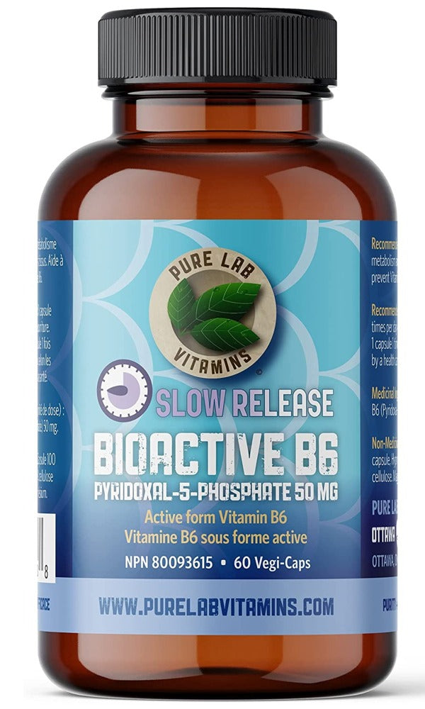 PureLabs Slow Release BioActive B-6 in 50 milligram per capsules ensures a more gradual uptake of the vitaminin its active formfor a safer way to maintain adequate levels of this nutrient through the day.Conditions that may benefit from vitamin B-6 include: Carpal tunnel syndrome Nausea of Pregnancy Hormone imbalance Oral contraceptive use Premenstrual syndrome (PMS) High homocysteine Depression and/or anxiety Migraine headaches Hypertension Water retention Compromised immunity Frequent infections High-protein diet Neuritis and neuropathyI nhibited dream sleep (REM)