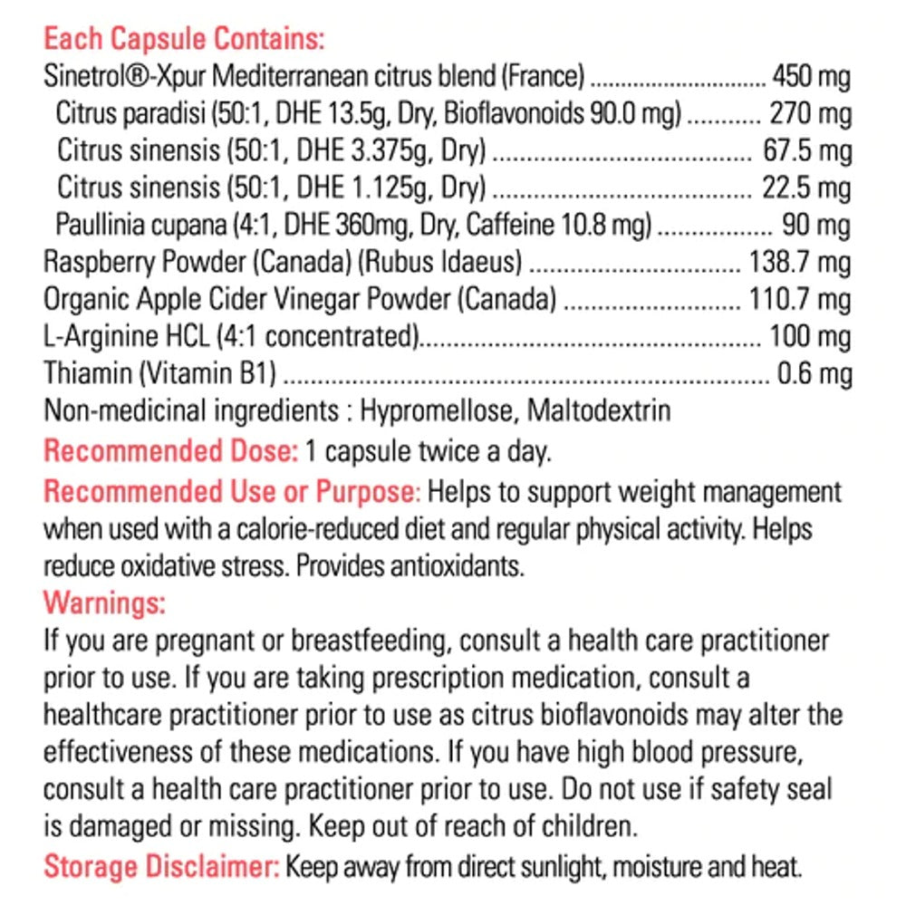 INGREDIENTSCitrus paradisi - Citrus sinensis - Paullinia cupana - Caffeine - Raspberry Powder - Organic Apple Cider Vinegar Powder - L-Arginine HCL - Thinamin (B1) non-medicinal ingredients: Hypromellose - Maltodextrin